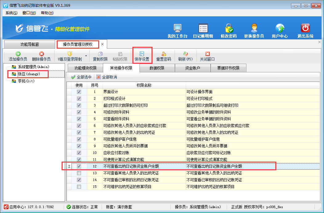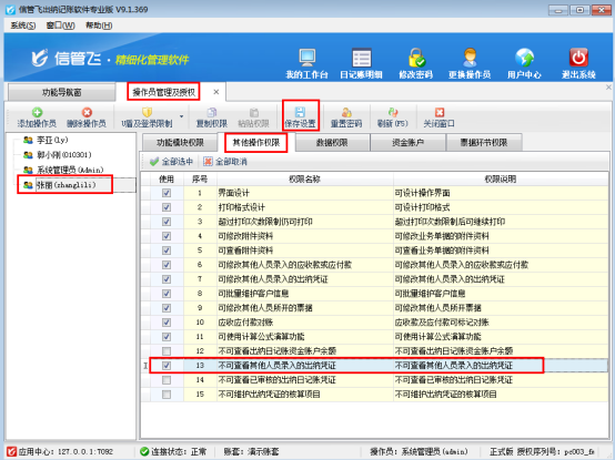????在功能導航窗點“系統管理”—》“操作員及授權”即可進入“操作員管理及授權”界面,選中操作員賬號,在“其他操作權限”界面將“不可查看其他人員錄入的出納憑證”權限勾選上,如下圖所示,設置操作員賬號“張亞”不可查看其他人員錄入的出納憑證。