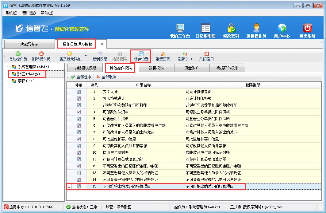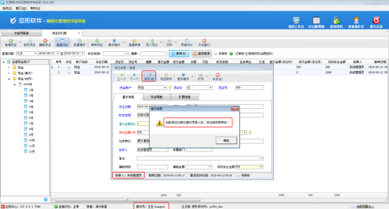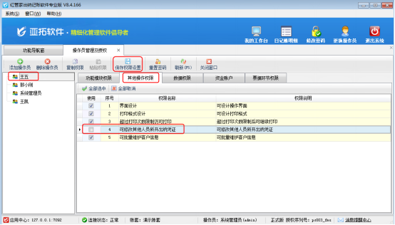 ????系統管理員登錄軟件,在功能導航窗點擊“系統管理”—》“操作員及授權”,進入“操作員管理及授權”界面,如下圖所示,選擇一個操作員,以操作員“張亞”為例,點擊“其他操作權限”,然后取消勾選“可修改其他人員所開出納憑證”,最后點擊“保存權限設置”,權限設置成功。