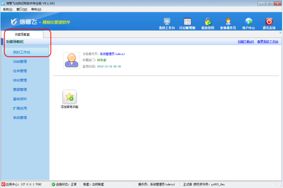 ????信管飛出納記賬軟件是集現金日記賬、銀行日記賬、應收應付往來賬管理、票據管理(支票管理、承兌匯票管理)、發票管理、工資管理、員工借款管理、費用報銷管理等為一體的財務出納管理記賬軟件(出納管理軟件)。日記賬憑證支持直接新增,也可以批量導入。對使用軟件之前的憑證需要錄入可以通過批量導入方式進行錄入。
