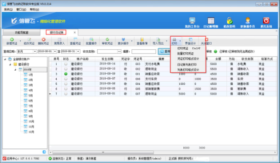 ????紅管家出納記賬軟件標準版和專業版在新增保存日記賬憑證后都可以直接打印憑證,軟件還支持批量打印憑證,如果您每天錄單數量較多,為了節省寶貴時間提高工作效率,您可以使用批量打印功能。下面我們介紹一下在紅管家出納記賬軟件專業版中批量打印銀行日記賬憑證的具體的操作步驟。