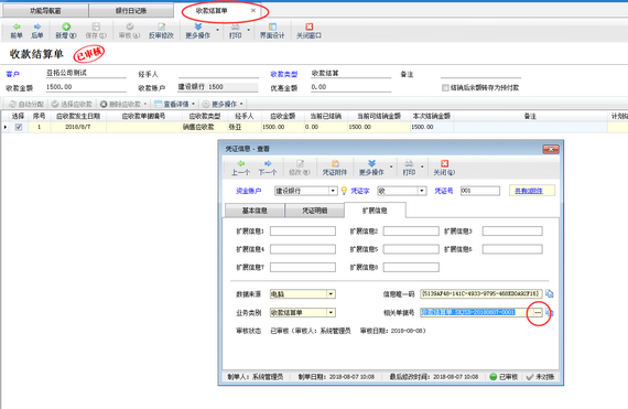 ????為便捷用戶操作,軟件支持設置憑證審核時自動審核相關結算單,本文以“信管飛出納記賬軟件”的收款結算單為例進行示范。