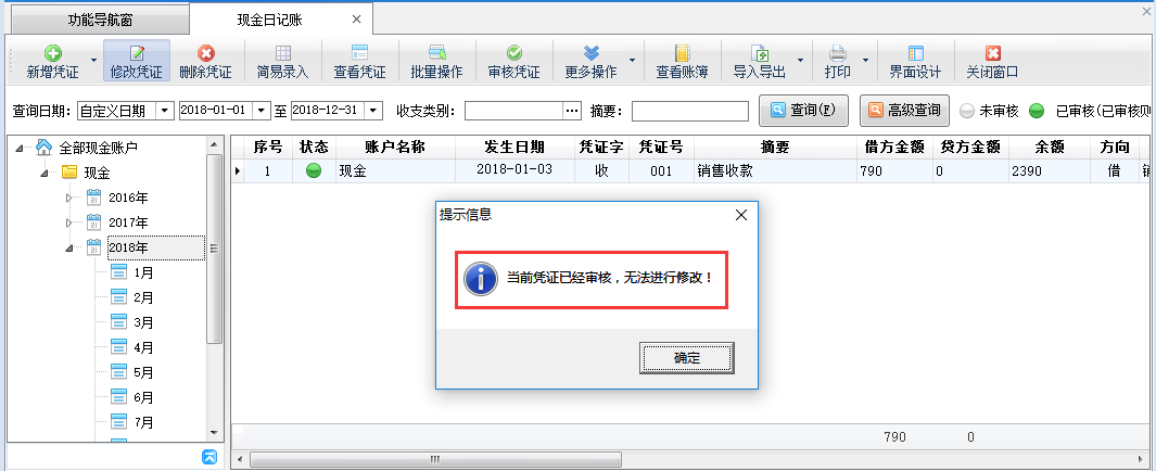 ????在功能導航窗點“出納管理”—》“現金日記賬”即可進入“現金日記賬”界面,對“已審核”的憑證進行刪除時,系統會提示“當前憑證已審核,無法執行刪除操作!”,如圖1所示。