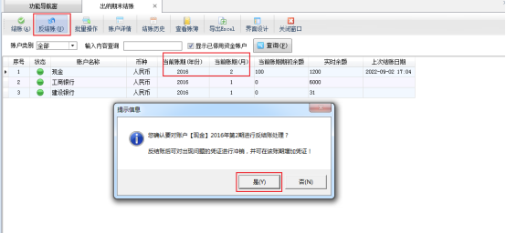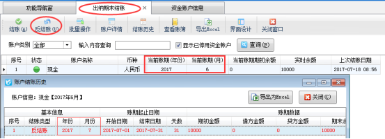 ????在功能導航窗點擊“出納管理”—》“出納期末結賬”,進入出納期末結賬界面,選中當前使用賬戶,點擊反結賬按鈕,反結賬完成后,相應賬戶回退到上一個賬期,賬期的起始日期是2016-01-01,如下圖所示:
