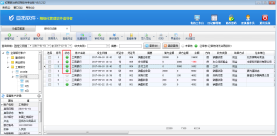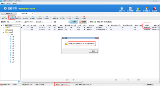 ????設置權限完成后,使用操作員“張亞”登錄軟件并打開現金及銀行日記賬列表,可以看到操作員只能查看自己錄入的憑證,無法查看其他人員錄入的憑證,如下圖所示: