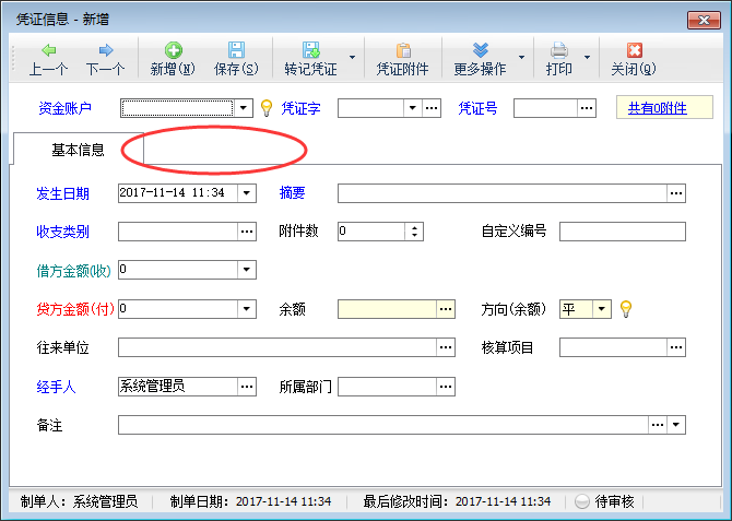????在出納軟件中直接新增憑證時,可以看到新增憑證界面部分數據項為藍色顯示,部分數據項是黑色字體顯示的,其中藍色顯示的數據項是必填項,新增憑證時,這些數據項是必須錄入數據的,如下圖所示。