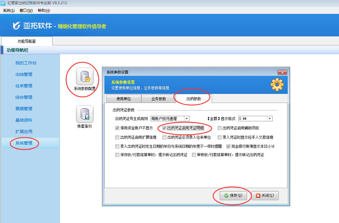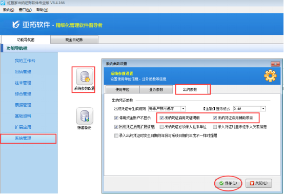 ????在功能導航窗點擊“系統管理”—》“系統參數配置”—》“出納參數”打開出納參數配置界面,然后啟用參數“出納憑證啟用憑證明細”、“出納憑證啟用輔助項目”,如下圖所示。