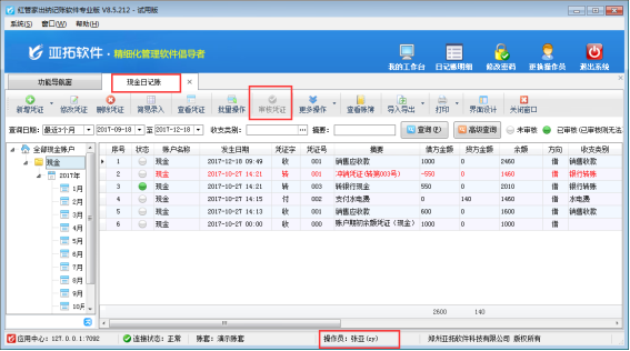 ????操作員“張亞”登錄軟件,在現金日記賬中找到剛才一審的現金日記賬,點擊“審核”,可看到“當前審核環節”變為“二審”如下圖所示: