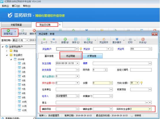 ????參數啟用后,在功能導航窗點擊“出納管理”—》“現金日記賬”打開現金日記賬界面,新增日記賬,在新增憑證界面即可顯示“輔助項目”、“憑證明細”,如下圖所示: