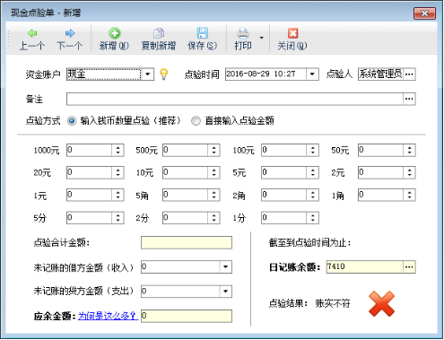 點驗結果:系統會自動獲取截止到點驗時間為止相應賬戶內的日記賬余額,如果“應余金額”與“日記賬余額”一致時,點驗結果為“賬實相符”,如果“應余金額”與“日記賬余額”不一致時,點驗結果為“賬實不符”。
