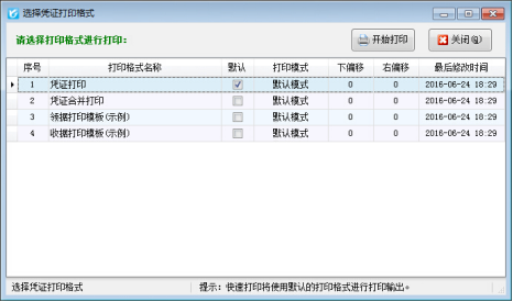 ????批量打印調用的是默認打印格式模板,也可以選擇其他的打印格式模板進行打印。選擇打印格式模板后,點擊“開始打印”按鈕進行批量打印憑證。