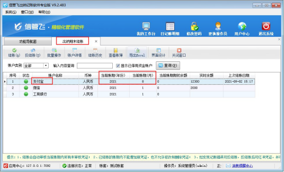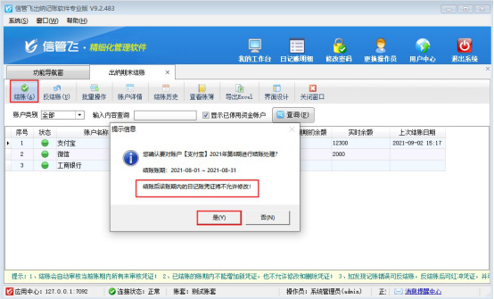 ????對資金賬戶“支付寶”進行結賬處理,選擇賬戶名稱為“支付寶”的記錄,點擊工具欄的“結賬”按鈕,系統會彈出提示“結賬賬期:2021-08-01~2021-08-31,結賬后該賬期內的憑證將不允許修改!”,點擊是,賬期會轉入下一賬期,如下圖所示: