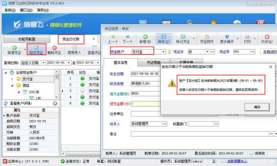 ????期末結賬后,在功能導航窗,點擊“出納管理”——》“現金日記賬”,進入“現金日記賬”界面,選擇現金賬戶“支付寶”8月份的出納憑證(結賬會默認把未審核的日記賬變為審核,修改需要先反審為未審核狀態)點擊“修改”按鈕,彈出的日記賬界面修改后點擊“保存”時會提示“當前賬期是2021年第9期,錄入的發生日期小于賬期的起始日期,請修改后再保存”,則無法修改之前賬期的憑證。如下圖所示: