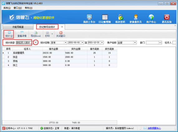 ????在“日記賬綜合統計”界面,統計類型選擇“按經手人統計”,然后點擊“統計”按鈕,可以根據經手人進行統計。另外,系統支持根據日期、賬戶名稱、部門、經手人等條件進行統計查詢。