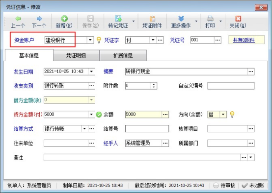 ????首先登記建設銀行的日記賬,銀行資金轉出,日記賬需要登記憑證字為“付”的憑證記錄,摘要和收支類別可選擇轉銀行現金,如下圖所示: