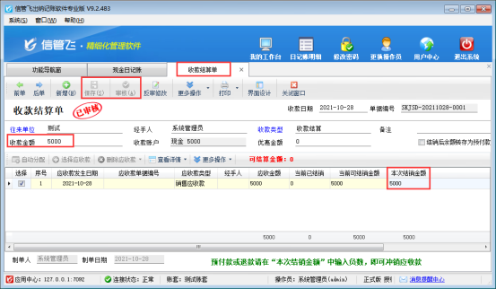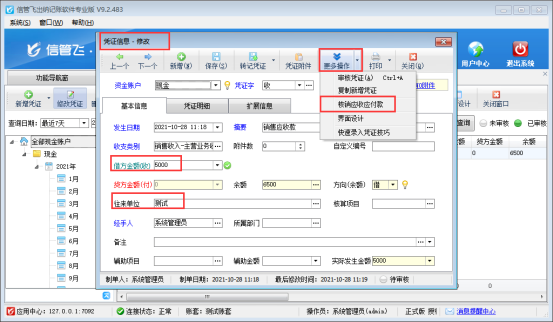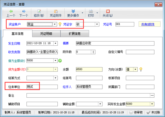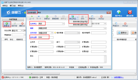 ????功能導航窗“往來管理”—》“應收款管理”中,新增一筆客戶“測試”的應收款記錄,應收金額5000元,保存并轉記現金憑證,如下圖所示: