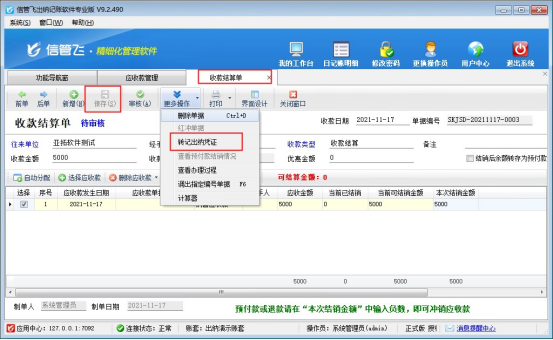 ????參數啟用完成后,在“往來管理”中打開應收款管理,選擇狀態為“未結銷”的應收款記錄,點擊收款結算,在彈出的結算單界面上,正常結算應收款,保存結算單后在“更多操作”下點擊“轉記出納憑證”(需要自動提醒轉記可參考此文章設置:出納軟件如何設置結算單保存或審核時提醒轉記日記賬?),如下圖所示: