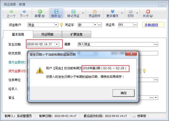 # 6.4.62 出納記賬軟件新增憑證時提示“發生日期小于當前賬期的起始日期”,如何解決?
