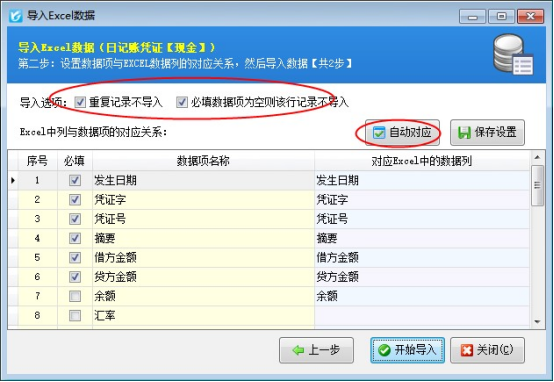????如果有多個資金賬戶,需要按資金賬戶進行導入,選擇資金賬戶后選擇Excel文件,下一步進行數據項對應,可以點擊“自動對應”按鈕,可自動對應Excel表頭內容和軟件中數據項,對應完成點擊“開始導入”,導入完成有導入結果。如下圖所示: