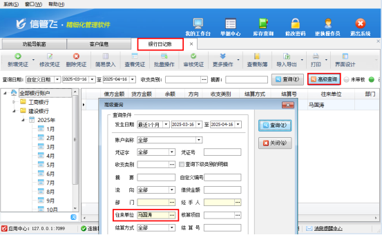 信管飛軟件刪除沒有開單的客戶信息時提示“當前選擇的往來單位已有出納日記賬記錄,不能刪除”,如何解決?如下圖所示: 出現此提示是因為此客戶在出納日記賬憑證中有錄入往來單位,需要分別打開現金和銀行日記賬列表界面。在工具欄“高級查詢”中按往來單位查詢,如下圖所示: 查詢后打開對應的出納日記賬憑證,可以修改刪除往來單位。刪除后重新到客戶信息界面,選擇客戶點擊刪除可以刪除成功。