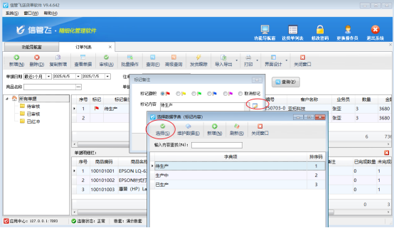 信管飛軟件支持對(duì)訂單列表、送貨單列表以及退貨單列表使用不同顏色旗幟標(biāo)記備注,把標(biāo)記常用內(nèi)容可提前維護(hù)到數(shù)據(jù)字典中,方便標(biāo)記時(shí)候直接選擇錄入,例如訂單列表,可以先把生產(chǎn)狀態(tài)維護(hù)在數(shù)據(jù)字典中,標(biāo)記直接使用。本文示范下如何操作? 訂單列表界面,雙擊標(biāo)記備注項(xiàng),點(diǎn)擊維護(hù)標(biāo)記備注內(nèi)容,進(jìn)入選擇數(shù)據(jù)字典(標(biāo)記內(nèi)容)界面,點(diǎn)擊維護(hù)數(shù)據(jù)可進(jìn)入標(biāo)記內(nèi)容維護(hù)。 在標(biāo)記內(nèi)容維護(hù)界面點(diǎn)擊新增,可以增加固定選項(xiàng)的標(biāo)記內(nèi)容名稱。 &