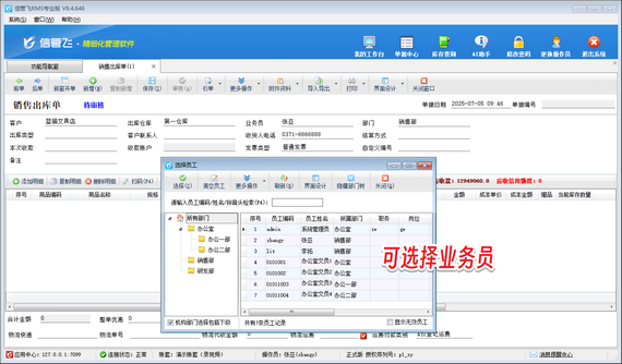 有用戶操作員賬號(hào)登錄軟件在新增單據(jù)時(shí),無(wú)法選擇業(yè)務(wù)員,如下圖所示,選擇業(yè)務(wù)員窗口看不到員工信息。 演示視頻觀看鏈接:選擇業(yè)務(wù)員窗口看不到員工信息,如何解決演示視頻 出現(xiàn)以上問(wèn)題的原因是:當(dāng)前登錄的操作員賬號(hào)沒(méi)有查看部門員工的權(quán)限。 解決方法如下:使用系統(tǒng)管理員賬號(hào)登錄軟件,在功能導(dǎo)航窗點(diǎn)擊“系統(tǒng)管理”—》“操作員及授權(quán)”打開(kāi)操作員管理及授權(quán)界面,選擇操作員賬號(hào),在“數(shù)據(jù)權(quán)限”界面將部門員工“查看所有數(shù)據(jù)”的權(quán)限勾選上,然后保存權(quán)限設(shè)置,如下圖所示。&
