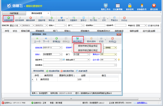 在企業(yè)財(cái)務(wù)流程里,員工先行墊付費(fèi)用、事后報(bào)銷是常見(jiàn)操作。而出納將費(fèi)用報(bào)銷單準(zhǔn)確轉(zhuǎn)記到流水賬、生成出納憑證,傳統(tǒng)方式既繁瑣又易出錯(cuò)。信管飛出納記賬軟件憑借便捷操作,讓這一過(guò)程輕松又高效。 操作便捷,流程清晰 快速錄入報(bào)銷單:在軟件功能導(dǎo)航窗點(diǎn)擊“綜合管理”—》“費(fèi)用報(bào)銷管理”,進(jìn)入報(bào)銷管理界面。新增錄入報(bào)銷單,信息填寫直觀簡(jiǎn)單,完成后點(diǎn)擊保存,輕松完成報(bào)銷單創(chuàng)建。 靈活轉(zhuǎn)記憑證:在新增報(bào)銷單界面,點(diǎn)擊“轉(zhuǎn)記憑證”,報(bào)銷單可靈活選