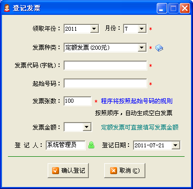 銷項發(fā)票目前主要分為定額發(fā)票、增值稅發(fā)票、一般機打發(fā)票三種,公司會計人員在稅局購領后,需要在第一時間內,在《紅管家財務出納記賬系統(tǒng)》中進行登記。主要登記信息包括: