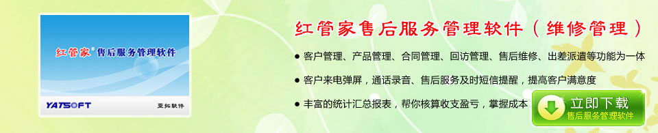 紅管家售后服務管理軟件是一款針對發貨、安裝、技術支持、維修等為一體的售后維修和客戶服務管理系統,主要包括客戶資料管理、合同管理、銷售出貨退貨、配件/零件采購、售后服務管理、發貨郵寄管理、客戶回訪管理、出差派遣管理等。支持短信自動通知、來電彈屏、通話錄音等。 經典售后服務管理軟件(維修管理軟件),歡迎下載試用。下載地址:http://www.yats