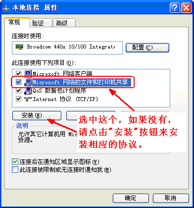 (3)檢查“本地連接”中是否啟用了“Microsoft 網(wǎng)絡(luò)的文件和打印機(jī)共享”,如果沒有這一項,請安裝相應(yīng)的協(xié)議。