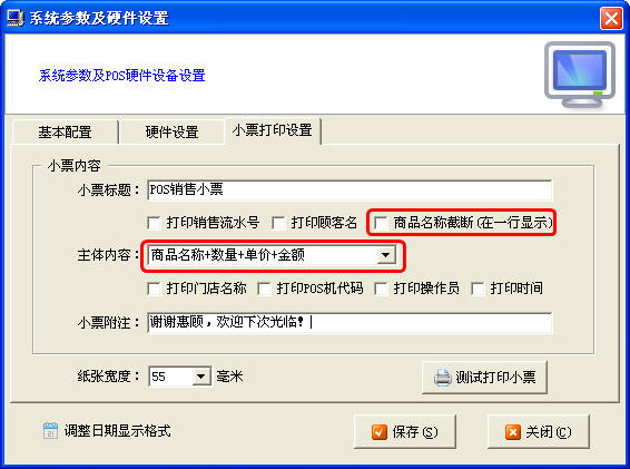 其中,是否打印銷售流水號(hào)、是否打印顧客名、是否打印門店名稱、POS機(jī)代碼、操作員、時(shí)間都可以進(jìn)行設(shè)置,打勾則系統(tǒng)會(huì)打印,不打勾則系統(tǒng)不打印。另外,系統(tǒng)也允許設(shè)置小票標(biāo)題和附注,具體對(duì)應(yīng)小票大哪個(gè)位置,請(qǐng)參見下圖。