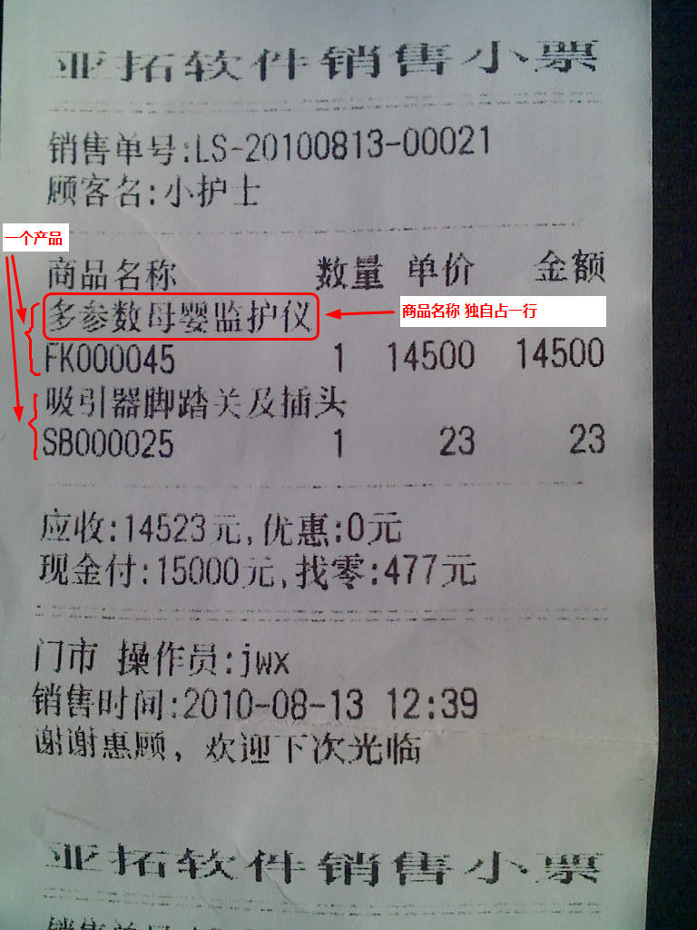 有關(guān)商品名稱截?cái)嗟膯栴},如果不復(fù)選“商品名稱截?cái)唷,則系統(tǒng)打印出的效果為下圖所示,商品名稱單獨(dú)占一行,一個(gè)商品總共占兩行。