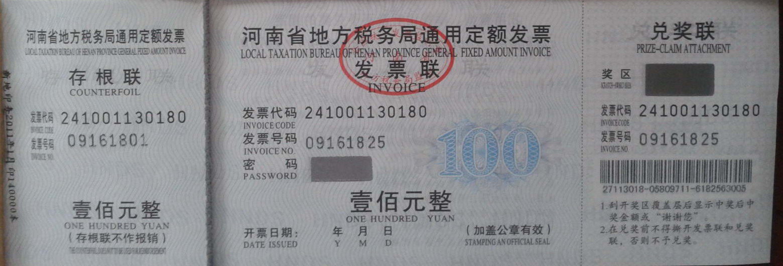 我公司目前針對非項(xiàng)目類產(chǎn)品銷售統(tǒng)一開具《河南省地方稅務(wù)局通用定額發(fā)票》,發(fā)票面值為100元/50元/10元,2011年4月前有少量《河南省鄭州市文化體育娛樂服務(wù)業(yè)定額》發(fā)票,發(fā)票面額為200元/100元/10元,均為正規(guī)發(fā)票,對我公司任何違規(guī)開票行為,用戶可隨時撥打河南省地方稅務(wù)局服務(wù)熱線12366-2進(jìn)行舉報和投訴。