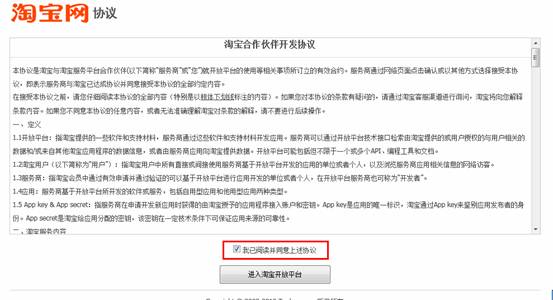 提交后,點擊“進入開發者中心”或者點擊網頁右上角的“我的控制臺”——》“開發者中心”。同意淘寶開放平臺協議。