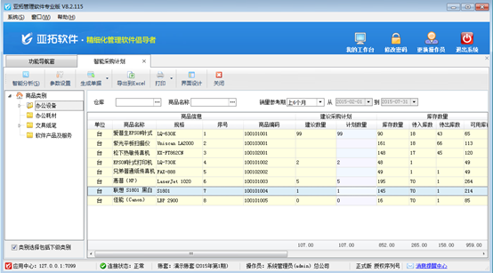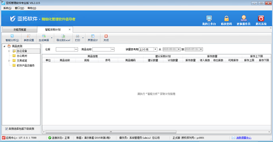 亞拓管理軟件支持由智能采購計劃生成采購計劃單。智能采購計劃功能可根據(jù)當前庫存情況,并可結(jié)合庫存上下限、同期銷售量、銷售訂單數(shù)量、待審核數(shù)量等條件進行組合運算,從而給出建議的商品采購量。可以把建議結(jié)果生成為采購訂單。智能采購計劃具體操作步驟如下:
