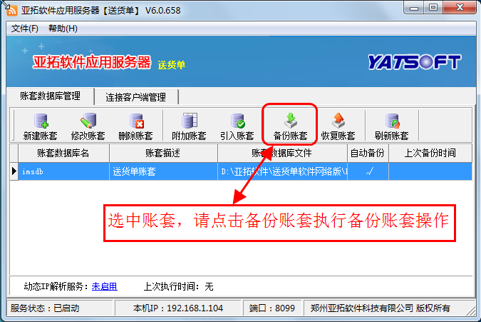 先在原主機上登錄軟件檢查下數據,確認沒問題后,打開亞拓軟件應用服務器,在亞拓軟件應用服務器上選中賬套,點擊“備份賬套”執行備份賬套操作,點擊備份賬套后,會彈出“備份賬套”窗口,可以選擇備份文件所存放的路徑(一般情況下默認存放在軟件的安裝目錄下DBBackup文件夾下),然后將剛才備份的賬套數據文件通過U盤或者移動硬盤等方式拷貝到新主機電腦上。