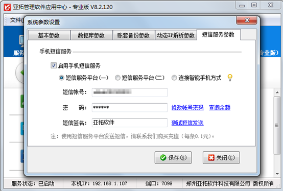 亞拓管理軟件專業(yè)版、標(biāo)準(zhǔn)版、星光版都是支持手機(jī)短信功能,我們可以根據(jù)自己的業(yè)務(wù)需求選擇相應(yīng)的版本,下面我們以亞拓管理軟件專業(yè)版為例介紹一下手機(jī)短信功能的使用方法及步驟: