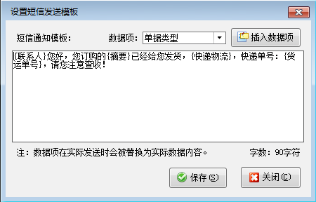 短信模板我們自己可以設(shè)置的,你可以選中你需要的數(shù)據(jù)項(xiàng)插入到短信模板中,這樣軟件會(huì)自動(dòng)調(diào)取單據(jù)中相應(yīng)的數(shù)據(jù)項(xiàng),我們?cè)诮o客戶發(fā)送短信時(shí)就會(huì)提取為實(shí)際數(shù)據(jù)。