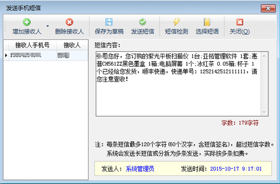 在銷售出庫單頁面上點(diǎn)“更多操作”—》“發(fā)送手機(jī)短信”—》“發(fā)送短信通知人(客戶訂貨人)”或“發(fā)送短信通知人(客戶收貨人)”就可以發(fā)送短信,軟件中可以設(shè)置為開單自動(dòng)發(fā)送短信,也可以手動(dòng)進(jìn)行發(fā)送,如圖5所示。