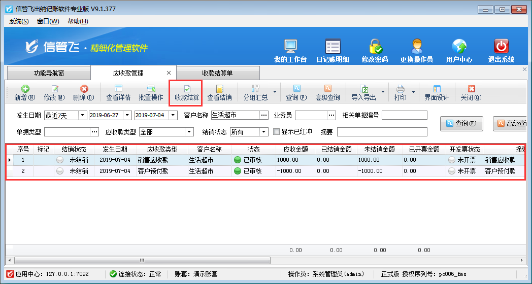 在應(yīng)收款管理界面工具欄有“收款結(jié)算”按鈕,可以打開收款結(jié)算單對(duì)客戶應(yīng)收款/預(yù)付款進(jìn)行收款結(jié)銷。如下圖所示,客戶“生活超市”應(yīng)收金額1000元,客戶預(yù)付款1000元,在單據(jù)明細(xì)“本次結(jié)銷金額”中,應(yīng)收款輸入正數(shù),預(yù)付款輸入負(fù)數(shù),正負(fù)抵消,即可使用客戶預(yù)付款沖銷應(yīng)收款。