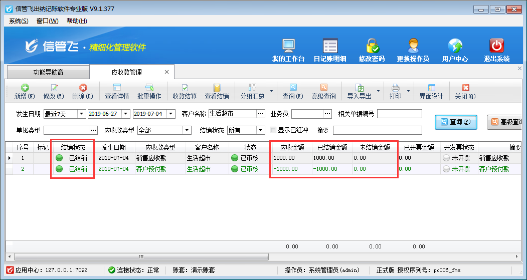收款結(jié)算單單據(jù)審核之后,會(huì)更新應(yīng)收款及預(yù)付款的結(jié)銷狀態(tài),在應(yīng)收款管理界面可以查看結(jié)銷情況,如下圖所示,剛剛新增的應(yīng)收款及預(yù)付款記錄結(jié)銷狀態(tài)已更新為“已結(jié)銷”,此時(shí)未結(jié)銷金額為0。