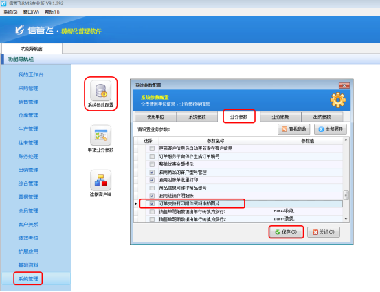 在功能導(dǎo)航窗點(diǎn)擊“系統(tǒng)管理”—》“系統(tǒng)參數(shù)配置”—》“業(yè)務(wù)參數(shù)”,打勾“訂單支持打印附件資料中的圖片”,保存設(shè)置,如下圖所示: