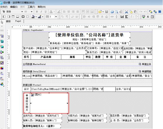 然后回到銷售出庫單界面,點(diǎn)擊“打印”—》“打印格式設(shè)計(jì)”—》“設(shè)計(jì)格式”,在打印模板上添加附件圖片數(shù)據(jù)項(xiàng),如下圖所示: