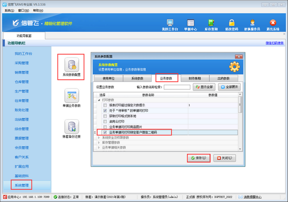 在功能導(dǎo)航窗點(diǎn)擊“系統(tǒng)管理”—》“系統(tǒng)參數(shù)配置”—》“業(yè)務(wù)參數(shù)”,在“打印參數(shù)”中啟用參數(shù)“業(yè)務(wù)單據(jù)可打印綁定客戶微信二維碼”,然后保存設(shè)置,如下圖所示。