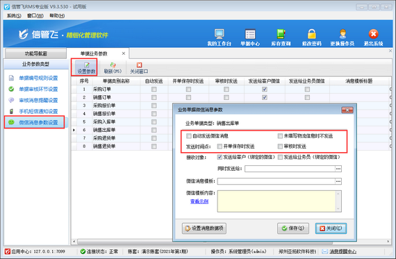 在功能導航窗點擊“系統(tǒng)管理”—》“單據(jù)業(yè)務參數(shù)”,在單據(jù)業(yè)務參數(shù)界面選擇微信消息參數(shù)設置,然后選擇需要設置的單據(jù),點擊“設置參數(shù)”即可設置自動發(fā)送微信消息,可根據(jù)需求設置單據(jù)保存或者審核時自動發(fā)送微信消息,同時也支持設置單據(jù)未填寫物流信息時不發(fā)送微信消息,如下圖所示:
