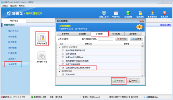 功能導航窗選擇“系統管理”—》“系統參數配置”—》“業務參數”進入業務參數配置界面,在系統安全及權限參數中勾選“啟用出納憑證收支類別權限控制”參數,如下圖所示: