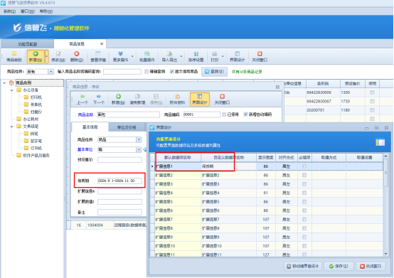 首先需提前在商品信息中添加保質(zhì)期信息,軟件商品新增界面默認(rèn)沒有此項(xiàng),可在擴(kuò)展信息中錄入,擴(kuò)展信息可自定義列名為“保質(zhì)期”,如下圖所示: