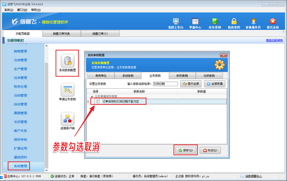 在功能導(dǎo)航窗點擊“系統(tǒng)管理”—》“系統(tǒng)參數(shù)配置”—》“業(yè)務(wù)參數(shù)”打開業(yè)務(wù)參數(shù)配置界面,在業(yè)務(wù)單據(jù)保存參數(shù)內(nèi)取消勾選“訂單保存時交貨日期不能為空”參數(shù),然后點擊“保存”按鈕保存參數(shù)設(shè)置,如下圖所示。