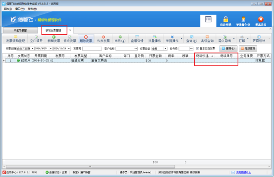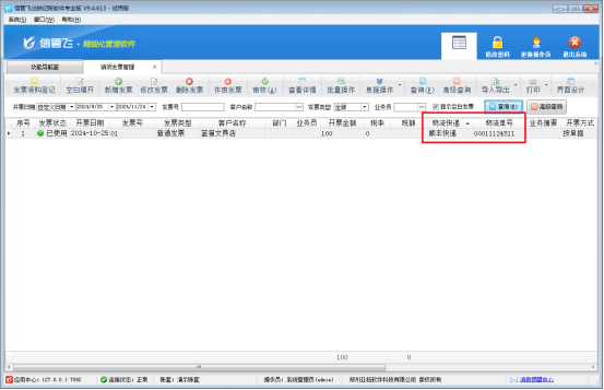 保存后物流快遞和物流單號即可在界面顯示,填寫好后保存發(fā)票,返回銷項發(fā)票管理界面,此時物流快遞和單號會正常顯示。