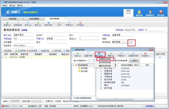 在現(xiàn)代企業(yè)的財務(wù)管理中,出納記賬軟件已經(jīng)成為不可或缺的工具,其中的發(fā)票管理功能可以讓企業(yè)高效快速地管理發(fā)票信息。部分用戶在使用過程中需要顯示出發(fā)票對應(yīng)的物流快遞和單號。本文以“信管飛出納記賬軟件”為例介紹下如何在銷項發(fā)票信息界面正確填寫物流快遞和快遞單號,以確保財務(wù)信息的準(zhǔn)確性和可追溯性。