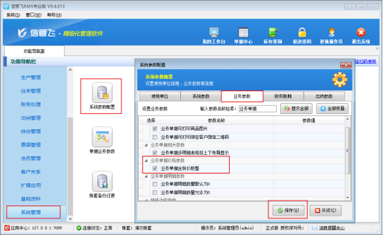 在左側(cè)的導(dǎo)航窗選擇“系統(tǒng)管理”—》“系統(tǒng)參數(shù)配置”的業(yè)務(wù)參數(shù),業(yè)務(wù)單據(jù)價格參數(shù)下勾選上“業(yè)務(wù)單據(jù)含稅價取整”,如下圖所示: